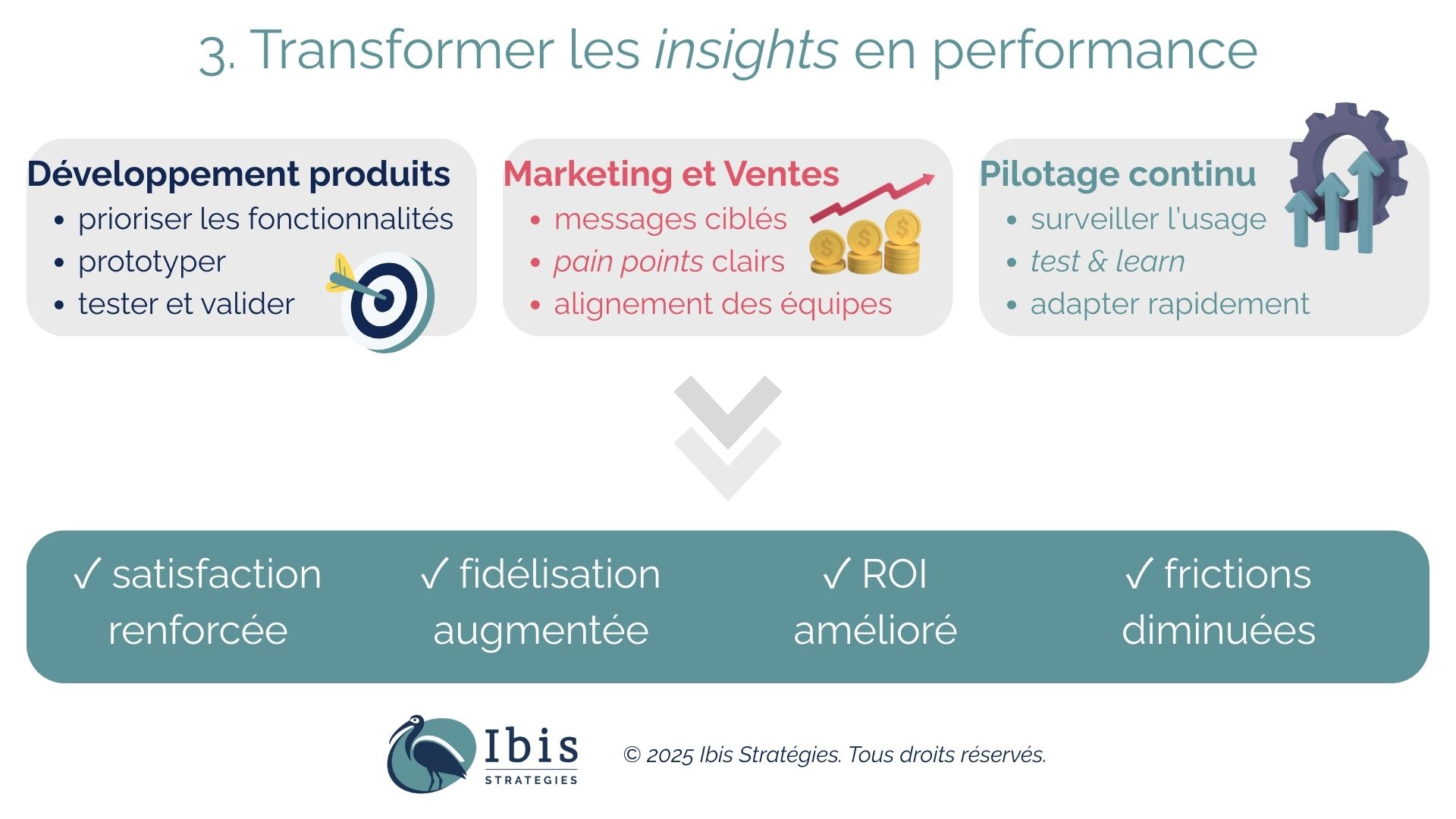 Une fois les informations consolidées, l’objectif consiste alors à les traduire en actions concrètes afin de réduire les frictions et d’augmenter la valeur délivrée. Il s’agit de transformer les insights collectés en leviers opérationnels.